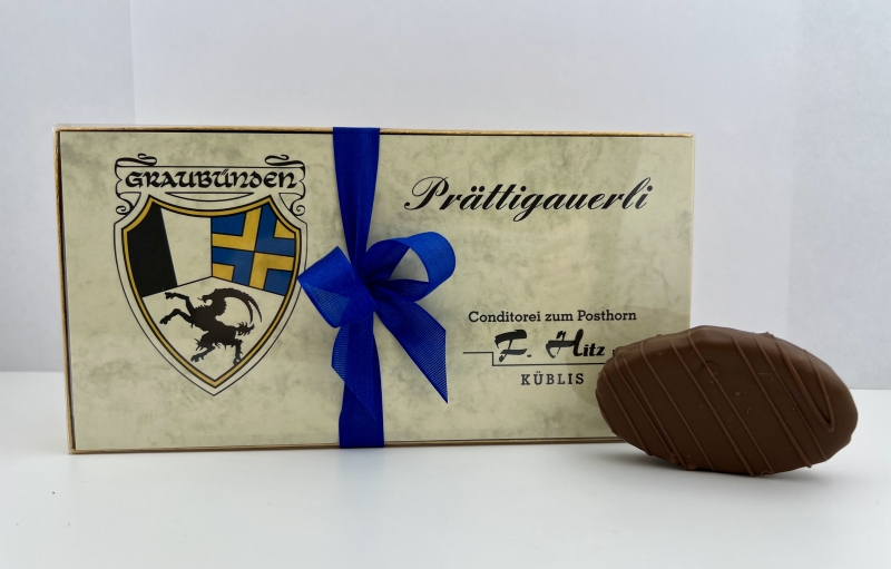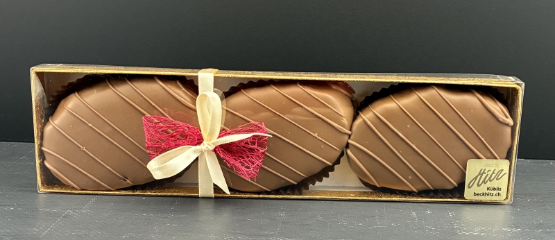 Eine leichte Pralinenfüllung zwischen zwei „Japonaisbödeli“, überzogen mit feinster Milchschokolade.
